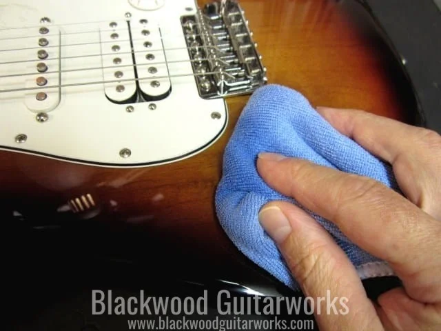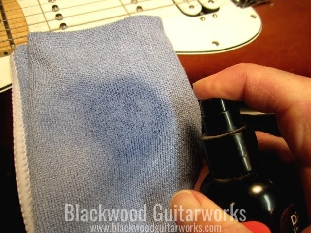 Spray a small amount of cleaner/polish onto the cloth and wipe the guitar in a circular pattern. Wipe around the pickups, bridge and controls. Most of these cleaners are also safe to use on the backside of the guitar neck, as well as the hardware, but read the label to be sure. If your guitar has a satin finish, find a cleaner specifically for that finish type. If you prefer not to use a commercial product, as previously mentioned, a slightly damp cloth will do the trick.