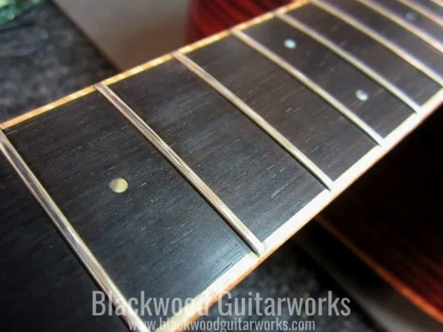 If the guitar has a rosewood fretboard, and it looks dry, you can apply a fretboard oil to bring it back to its lustre. I say “fretboard oil” to steer you in the right direction, which is to the guitar brand names you know and trust. The truth is, there are a lot of products that will do the job, but those made by Planet Waves, Dunlop, or Fender, for example, are sure to be safe for use on your guitar. Oiling the fretboard doesn’t need to be done often- in fact, some people overdo it. It truly depends on the environment you live in (humidity levels) and how often the guitar is played. So, my rule of thumb is- if it looks dry, oil it. If it doesn’t, don’t. Keep in mind that maple fretboards do not require oil. Ebony, on the other hand, may benefit from it periodically, but it is a tight-grained wood and penetration can be minimal. Look for products that are for all wood types to be the most effective.