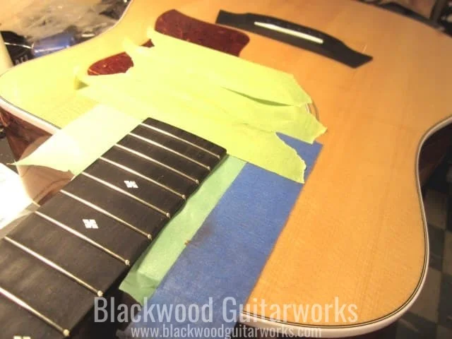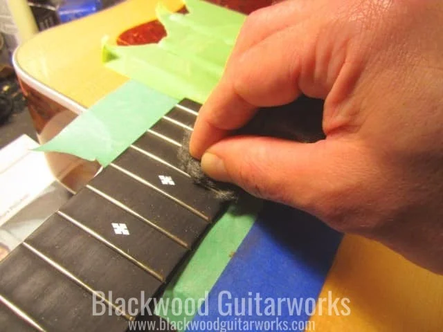 If the fretboard on the guitar has grime and dirt accumulating on it, you can use ultrafine-grade steel wool (#0000) to remove the buildup safely. Using the steel wool will also give your fretboard and frets a nice polished look. Always go with the grain, which is most often length-wise with the neck. Be careful not to scratch large fretboard inlays in the process (lighten up the amount of pressure used around these sensitive areas). Some people will use a scraper to clean off the gunk buildup, then follow up with the steel wool, and that works too. Steel wool is messy, so tape off the guitar to protect it from debris and scratching. The pickups, being magnetic, will attract all the loose steel wool fibres, so tape them off well. Also, for safety sake, wear a particulate mask and eye protection as the small steel fibres can get everywhere. Before removing the tape, lightly brush away the remnants with a rag or soft-bristle paintbrush.