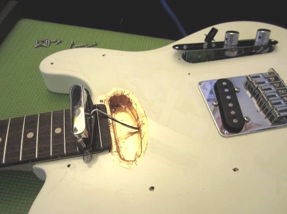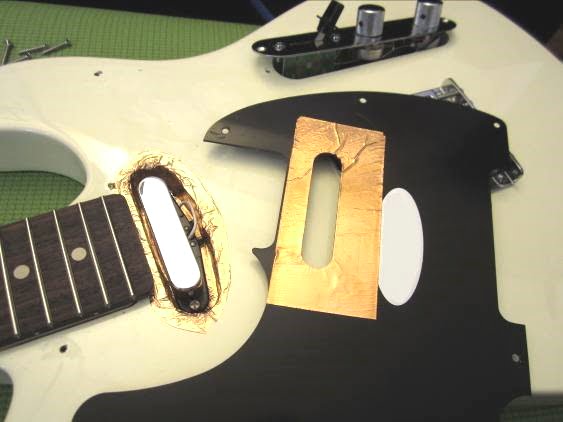 Shielding helps prevent any unwanted noise like hum and RF frequency coming through the signal of your guitar, most notably with single coil pickups. The idea with shielding is to enclose the electronics within a protective barrier that will repel radio frequency interference. You can use shielding paint or, more effectively, copper tape in the pickup and control cavities of the guitar. Additional steps can be taken as well, going to the extent of shielding every run of wire and cavity. Whatever way you choose, the shielding, once applied, must be in contact with the ground. A common method when using paint is to solder a ground wire from one of the pots to a solder lug washer (or terminal lug) and then screw the lug into the cavity wall.