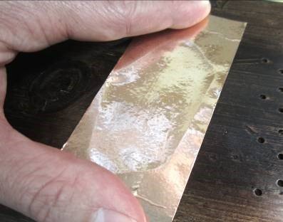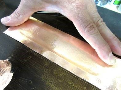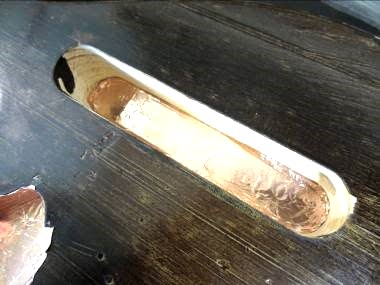 Using copper tape is more work, but it may be more effective in preventing RF interference. Before starting, blow out any dust and wipe down thoroughly with a rag. You will need to cut out strips of copper tape to fit into each of the cavities. You will need enough to apply to the bottom of the cavity, with the excess going to the side walls. One way to measure it is to lay the foil over the cavity and trace around it lightly with your finger, creating an indent on the foil (pictured below). Add another 1/4″ around the crease, and cut out. Another strip should be applied to the sidewalls, with some slight excess folded over the top of the cavity to mate with a control plate or pickguard. If your guitar has a pickguard, like a Strat-style, the underside of the pickguard should be taped as well, to enclose the electronic cavity. The excess tape that was folded over the top of the cavity should then mate with the underside of the pickguard, creating a full enclosure. Make sure that all strips of foil overlap each other.